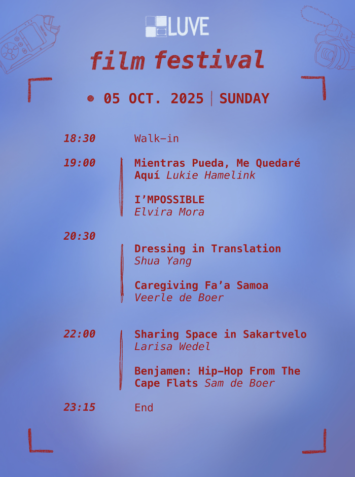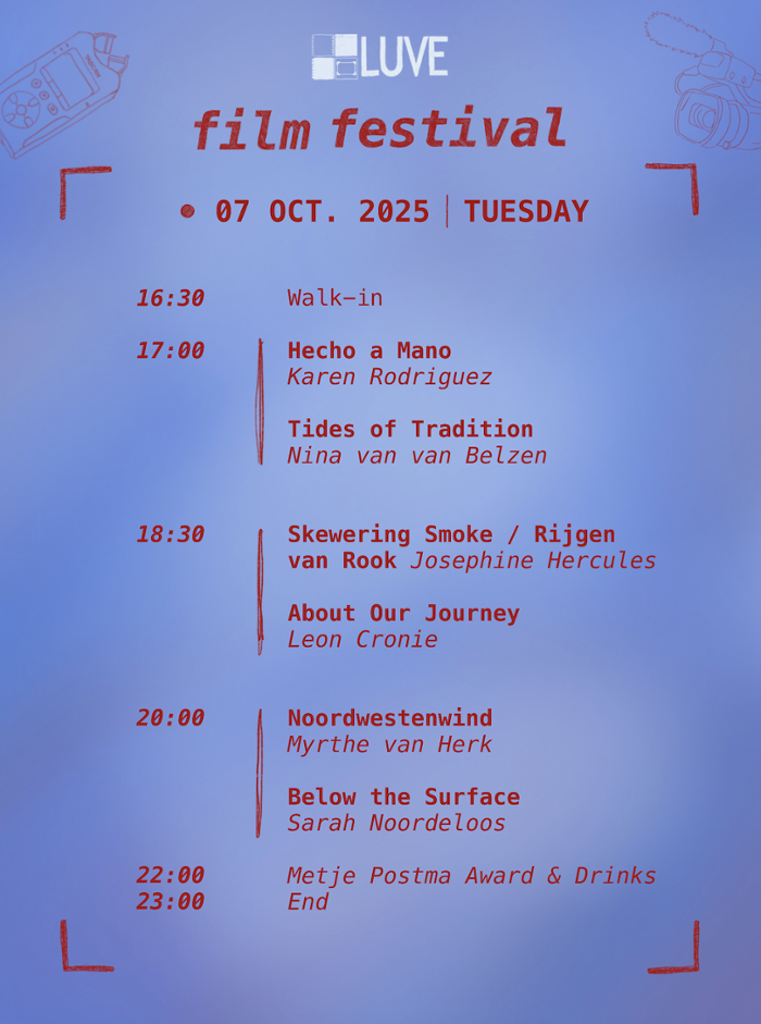 In oktober tonen afgestudeerden van Visual Ethnography hun films op het LUVE-festival! Het festival wordt dit jaar gehouden in Rotterdam, in de bruisende Studio de Bakkerij. De 18 korte etnografische films die door studenten zijn gemaakt, onderzoeken onderwerpen als erfgoed, het meer-dan-menselijke, eetgewoonten, migratie en nog veel meer.
