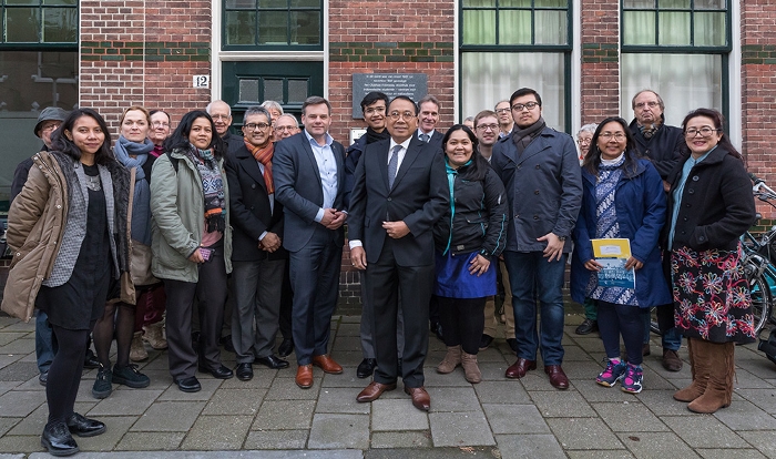Bij de onthulling van de gedenksteen op 5 maart was een breed gezelschap aanwezig: bewoners van het studentenhuis, de Indonesische ambassadeur I Gusti Agung Wesaka Puja, leden van Perhimpunan Pelajar Indonesia (de huidige Indonesische studentenvereniging), wethouder Paul Dirkse en natuurlijk de initiatiefnemers van het KITLV. Oostindie: ‘Deze steen heeft hopelijk een verbindende functie en maakt een stukje Leids-Indonesische geschiedenis zichtbaar.’