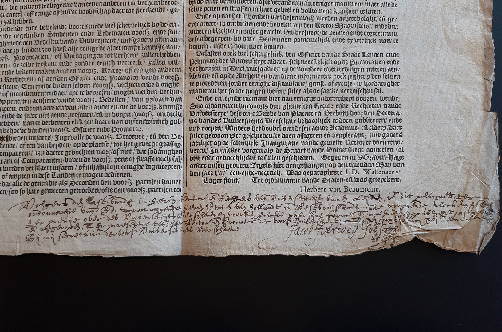 Ook in deze aflevering van de podcast komen er weer originele documenten op tafel uit de Bijzondere Collecties van de Universitaire Bibliotheken Leiden (UBL). Zo brengt Van Marion onder meer plakkaten mee die zijn uitgegeven door het College van Bestuur, en waarin studenten worden opgeroepen zich koest te houden. Deze waarschuwingen werden aan de deur van het Academiegebouw genageld.