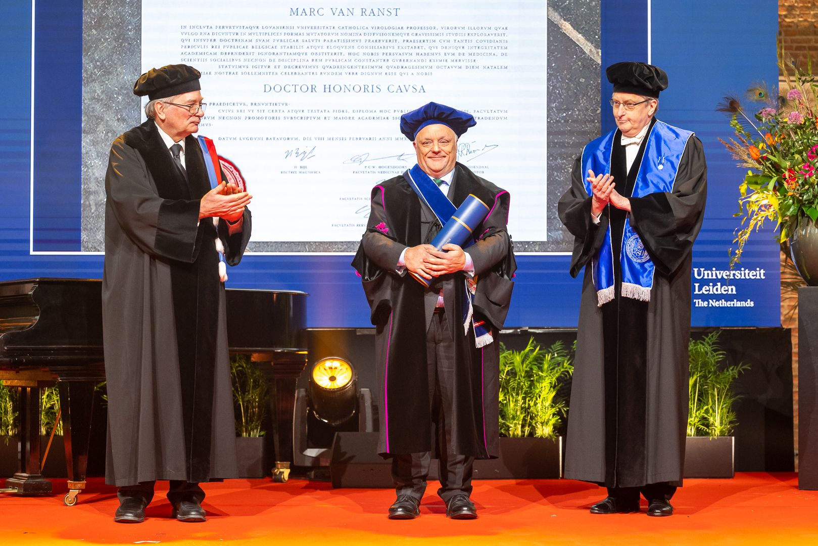 Van Ranst, hoogleraar aan de KU Leuven, kreeg zijn eredoctoraat voor zijn wetenschappelijke bijdragen aan de epidemiologie en de virologie, zijn adviezen aan de Belgische overheid rond de Covid-pandemie en zijn uitleg richting de burger. Tijdens de Covid-epidemie was hij een van de belangrijkste adviseurs van de Belgische overheid. Hij kreeg te maken met ernstige bedreigingen en moest met zijn gezin zelfs een tijd onderduiken. In zijn dankwoord riep hij op om op te staan tegen de bedreiging van wetenschappers. 'We mogen dit nooit normaal gaan vinden.' In 2025 bestaat de KU Leuven 600 jaar, nog geen week later wordt de 450ste verjaardag van de Universiteit Leiden gevierd. Van Ranst stelde voor om die verjaardagen samen te vieren.