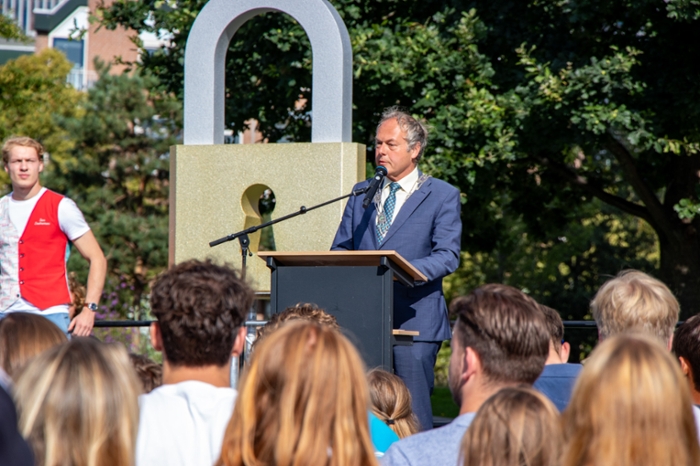 Bij zijn laatste EL CID in functie sprak burgemeester Henri Lenferink de nieuwe studentenlichting toe. Geniet, maar houdt rekening met die bijzondere stad, was zijn boodschap. ‘Leiden ligt centraal, tussen New York en Moskou, tussen Londen en Berlijn, tussen Amsterdam en Rotterdam en tussen het strand en de Heinekenbrouwerij.’ Ook rector magnificus Hester Bijl wenste de studenten een fijne week en vooral een goede start van hun studie toe.