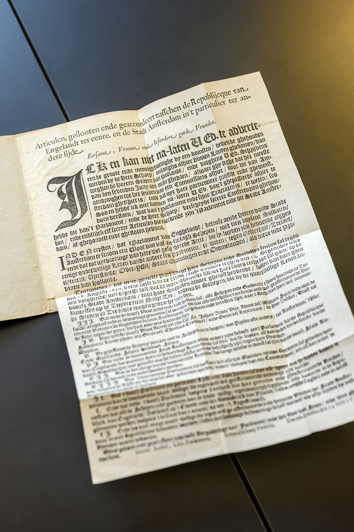 ‘Dit pamflet, algemeen bekend als De Elf Artikelen, komt uit 1650 en is een zogenaamd verdrag tussen de stad Amsterdam en de Engelse politicus Oliver Cromwell (1599-1658)‘, vertelt Hylkema. ‘Het verdrag was gefabriceerd door de kring rond stadhouder Willem II (1626-1650) die de groeiende macht van Amsterdam maar niets vond en de stad wilde aanvallen. Die aanval zou gerechtvaardigd worden door dit verdrag omdat kort daarvoor de Republiek had besloten geen zaken met Cromwell te doen en Amsterdam dus lak aan die afspraak zou hebben gehad.’
