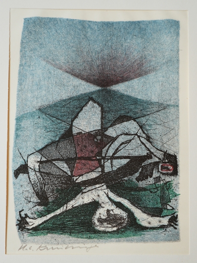 Harry van Kruiningen (1906-1996) was kunstschilder, kinderboekenschrijver en vooral productief graficus. De teksten die Van Kruiningen inspireerden zijn ontleend aan het elfde gezang van het Gilgamesj-epos. Hierin gaat Gilgamesj in zijn zoektocht naar onsterfelijkheid op bezoek bij Ut-napisjtim, de enige overlevende van de zondvloed. Dit verhaal toont veel opvallende parallellen met het zondvloedverhaal uit Genesis.