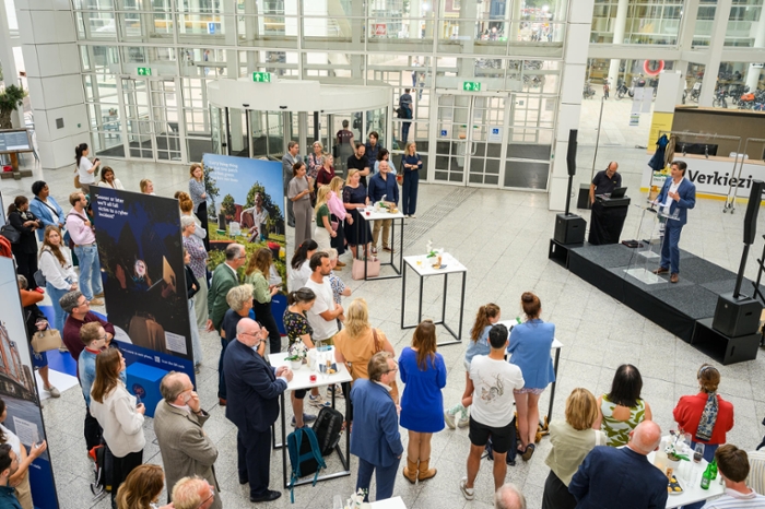 Timo Kos, vicevoorzitter van het college van bestuur, opende de bijeenkomst en benadrukte de bijzondere betekenis van 25 jaar Campus Den Haag: ‘Onze onderzoekers adviseren de gemeente, werken samen met Haagse organisaties, onderzoeken Haagse vraagstukken. Voor én met de inwoners van de stad. Deze tentoonstelling geeft daar acht prachtige voorbeelden van.’