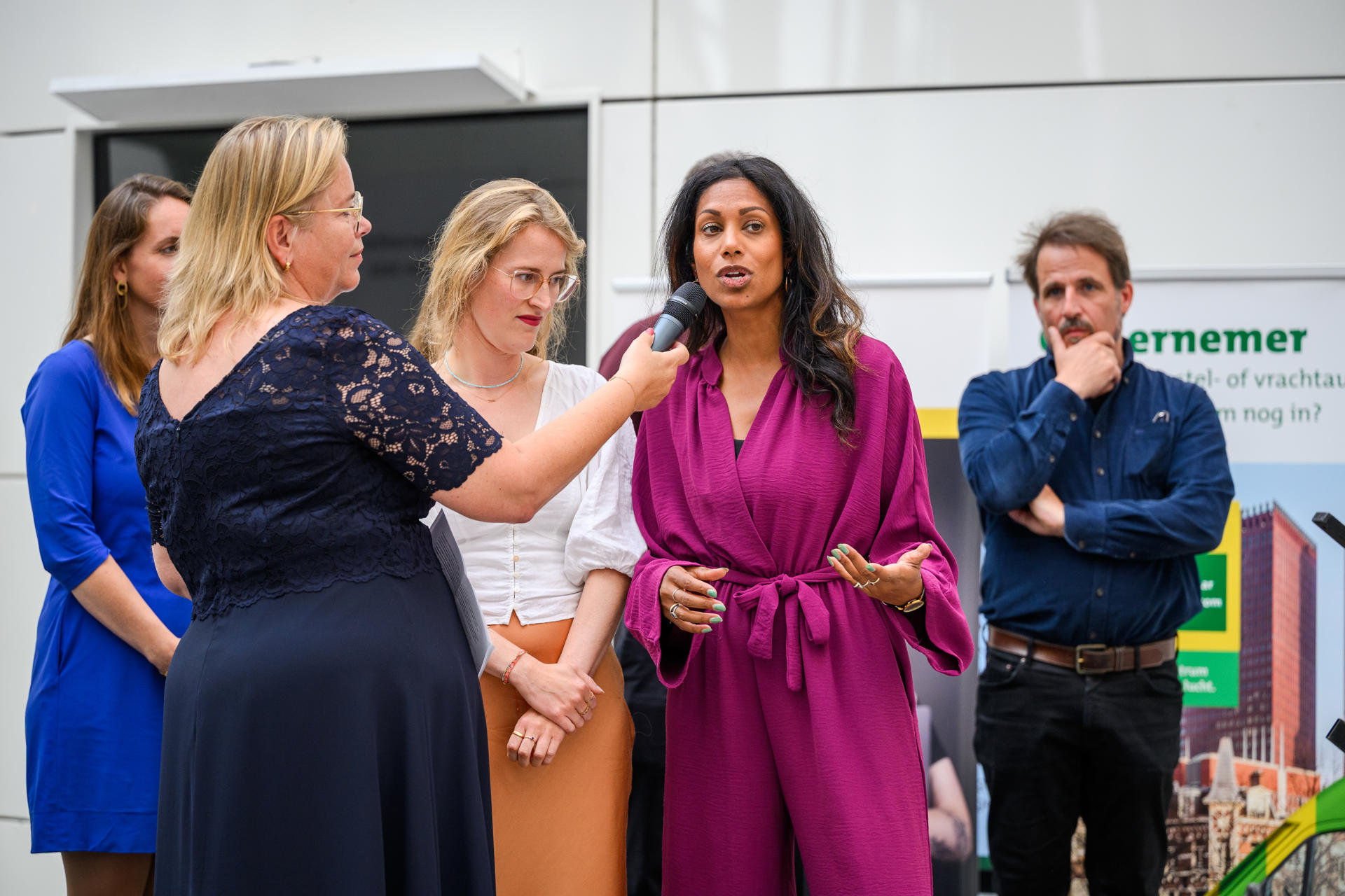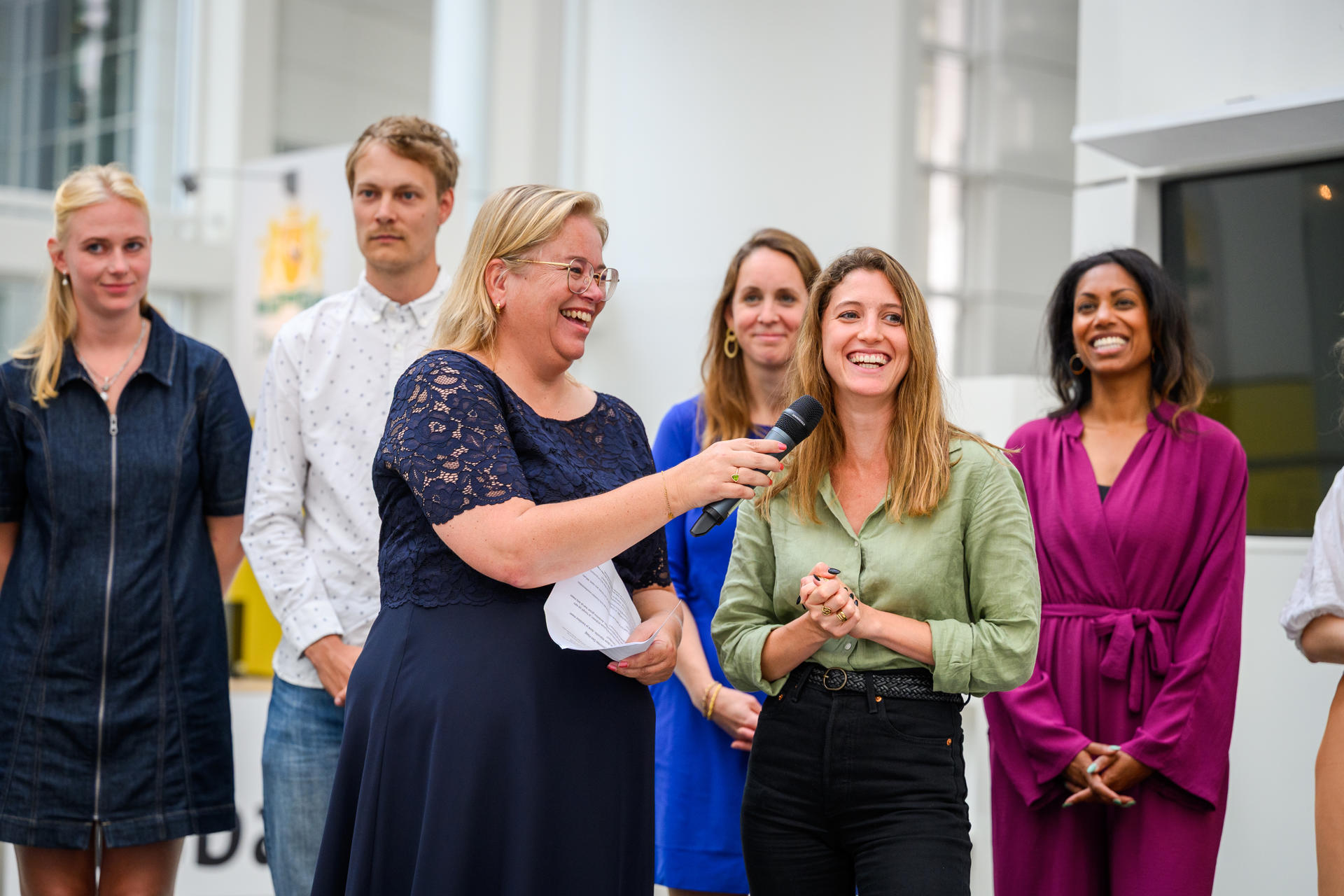 Journaliste Margriet van der Zee nodigde de onderzoekers uit op het podium en vroeg hen hoe het voelt om zichzelf terug te zien in het stadhuis. ‘Ik heb mezelf nog nooit zo groot gezien!’ zegt Cristina del Real. Ze onderzoekt hoe we ons moeten voorbereiden op cybercriminelen: ‘Het is belangrijk dat organisaties transparant zijn over cybercrime – ze zijn vaak terughoudend, maar we moeten ervaringen delen en zo onze kennis vergroten.’