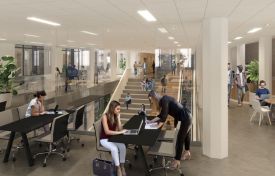 Op de derde verdieping bevinden zich straks de onderwijsruimten van de Universiteit Leiden, die vloeiend aansluiten op de studie- en werkomgeving van de Open Universiteit. Een verdieping hoger verbinden Leiden en TU Delft hun werelden van technologie, beleid en maatschappelijke impact. Op de vijfde verdieping zijn er studie- en werkplekken van Universiteit Leiden en het LUMC richt zich hier op onderzoek naar preventieve zorg en gezondheid. Ook Universiteiten van Nederland vindt hier zijn plek. Helemaal bovenin ontstaat een bruisend centrum voor studenten, met een open common room en een dakterras met indrukwekkend uitzicht over de Haagse skyline en het Binnenhof.